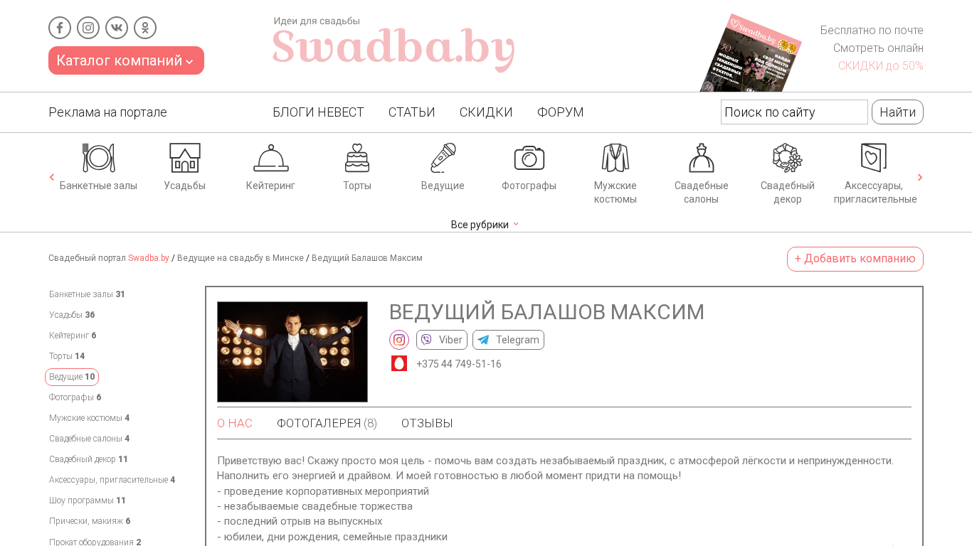 | SEO-описание | Балашов Максим Ведущий на свадьбу в Минске с фото и отзывами. Адреса, контакты и отзывы. |