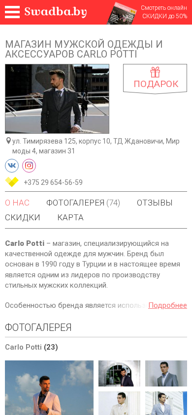 | SEO-описание | Магазин мужской одежды и аксессуаров Carlo Potti - Свадебные костюмы в Минске. Адреса, контакты и отзывы. |