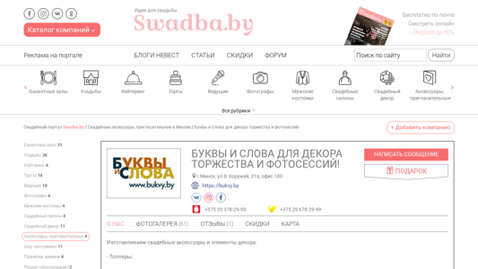 | AI-анализ | Проект веб-сайта "Буквы и Слова для Декора и Фотосессий!" является брачным порталом в Минске, Беларусь, предлагающим уникальные подарки и аксессуары для свад. Он предоставляет адреса, контакты и отзывы. В верхней части содержания представлены залы для свадеб, усадьбы, кейтеринг, торты, ведущие фотографы, костюмы для мужчин, салоны для невест, декор свадеб, аксессуары, приглашения, программы шоу, прически, макияж, аренда оборудования, транспорт для свадьбы, видеосъемка, сельские комплексы, музыканты, кавер-бэнды, кольца и фейерверки. Доменное имя — bukvyislova.swadba.by. |