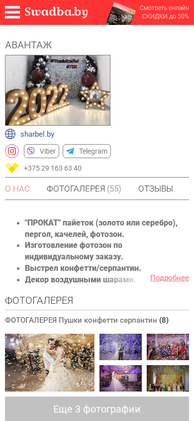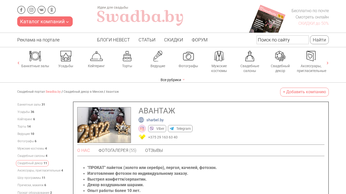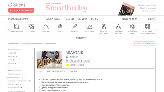 Портал Avantagh.swadba.by — это студия оформления мероприятий, расположенная в Минске, Беларусь. Она специализируется на декорировании свадеб и украшении цветами. Сайт предоставляет информацию о банкетных залах, услугах кулинарии, тортах, ведущих фотографах, костюмах для мужчин, салонах для невест, свадебном декоре, аксессуарах, приглашениях, шоу, программах, прическах, макияже, аренде оборудования, транспорте для свадьбы, видеосъемке, сельских комплексах, музыкантах, кавер-бандах, кольцах, салютах и фейерверках. Портфолио студии представлено на сайте с множеством фотографий.