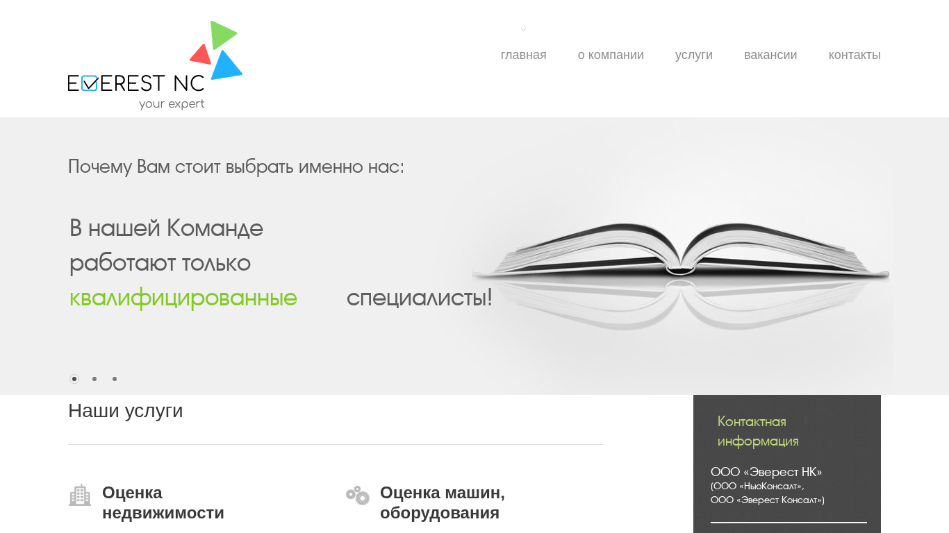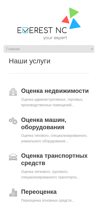 Сайт является белорусской консалтинговой компанией 'Эверест НК', предлагающей услуги оценки недвижимости, оборудования и транспорта. Главная страница разделена на секции для компании, услуг по оценке и контактов. Услуги по оценке включают оценку административных, коммерческих и производственных объектов, оборудования и различных видов транспорта. Компания подчеркивает профессионализм и пунктуальность своей команды. Информация о контактах включает несколько телефонных номеров и электронную почтовую адресу. На сайте также представлены ссылки на карты и направления с использованием Яндекс.Карт.