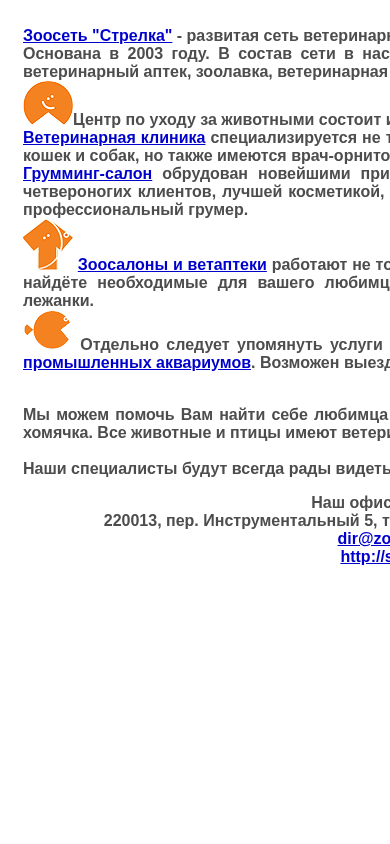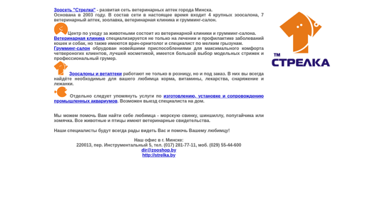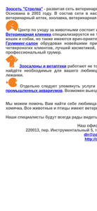 | AI-анализ | This online resource is the developed network of veterinary apothecaries in the city of Minsk, Belarus, named "Зоосеть Стрелка". Founded in 2003, the network currently includes four large animal salons, seven veterinary pharmacies, a zoo shop, a veterinary clinic, and a grooming salon. The center for animal care consists of the veterinary clinic and grooming salon. The veterinary clinic specializes not only in treating and preventing diseases in cats and dogs, but also has a vet ornithologist and a specialist for small rodents. The grooming salon is equipped with the latest equipment for maximum comfort for four-legged clients, premium cosmetics, a wide selection of modeling haircuts, and a professional groomer. The animal salons and pharmacies operate not only retail but also wholesale. Here, |
