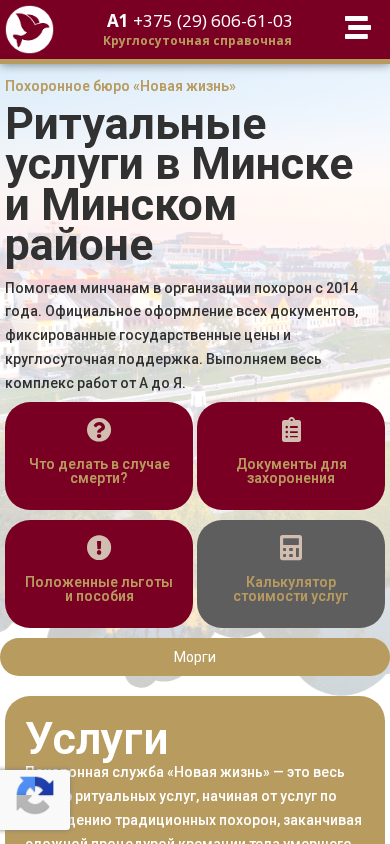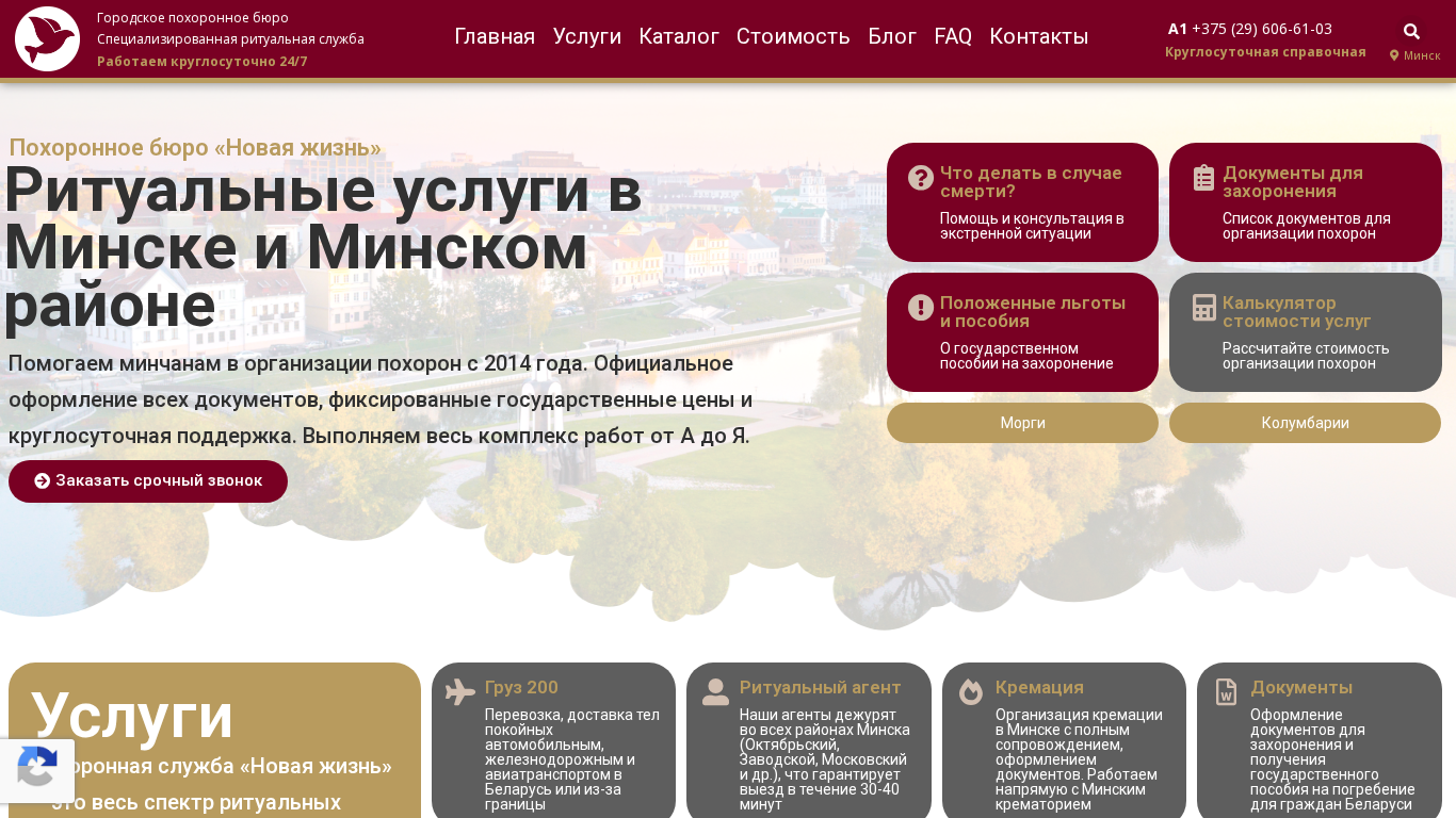| AI-анализ | The web project "Ritual Services in Minsk 24/7 | Private Bureau 'Novaia Zhizn'' is a city funeral bureau offering specialized ritual services. Operating 24/7, it assists Minsk residents since 2014 with official document processing, fixed state prices, and round-the-clock support. The bureau provides a full range of services from document preparation to burial or cremation. In case of emergency, consultation and assistance are available. The site includes a catalog of services, pricing information, a blog, FAQ, and contacts with the phone number +375 (29) 606-61-03 for a 24/hour hotline. The offered services encompass traditional funeral arrangements and complex cremation procedures for remains transported from abroad. The bureau also provides transportation of deceased persons within Belar |