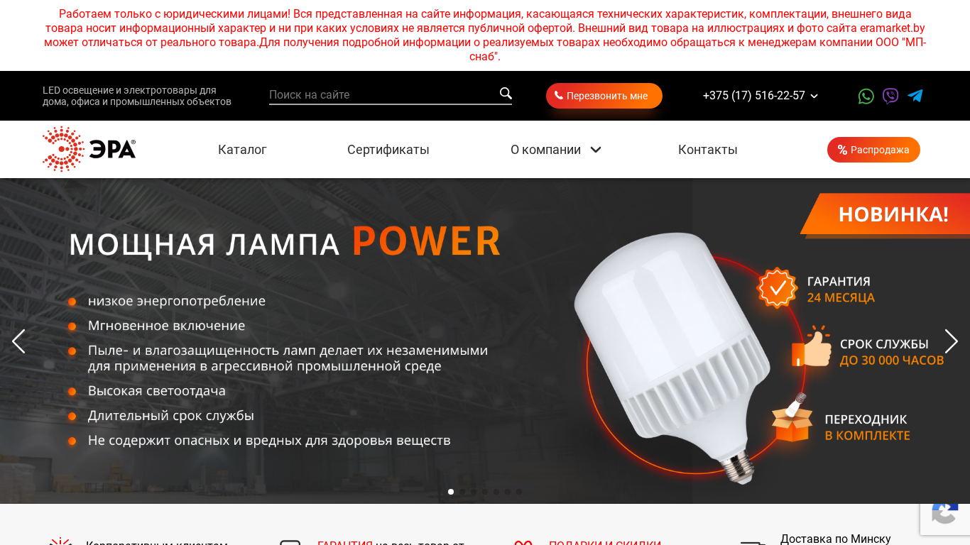 | AI-анализ | The web project 'Электротехническая продукция ЭРА по оптовым ценам' (EraMarket.by) offers LED lighting and electrical products for residential, office, and industrial settings in Minsk, Belarus. The company, OOO МП-снаб, is the official supplier of ERA brand goods. The website provides a catalog of lighting and electrical items, including information on certifications and specifications. However, the information provided is for informational purposes only and not a public offer. The visual representation of the products on the site may differ from the actual items. For detailed product information, contact the company at the listed phone numbers. The site offers a corporate discount up to 10%, a warranty of 24 months on all items, and gifts and discounts for corporate clients. Free delivery in Minsk for orders over 200 |
