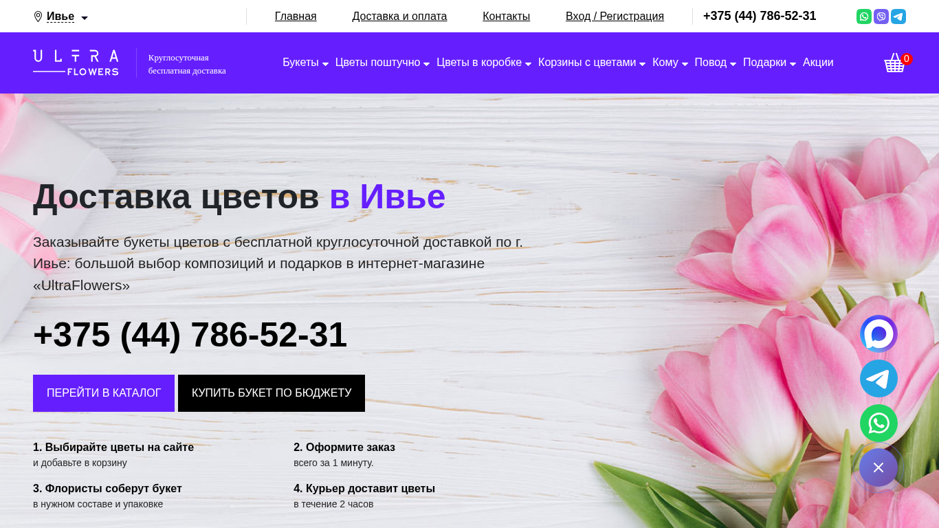 | SEO-описание | Бесплатная круглосуточная доставка цветов в Ивье ▶Недорогие букеты - от 5 рублей за цветок ⇒ Заказывайте +375 (44) 786-52-31 ✔Скидки на цветы ✔Фото перед отправкой ✔Более букетов ☛Интернет-магазин «Ultra Flowers» |