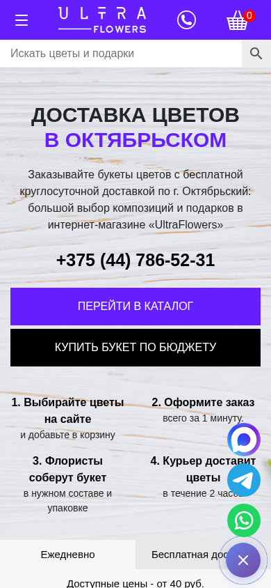 SEO-описаниеБесплатная круглосуточная доставка цветов в Октябрьском ▶Недорогие букеты - от 5 рублей за цветок ⇒ Заказывайте +375 (44) 786-52-31 ✔Скидки на цветы ✔Фото перед отправкой ✔Более букетов ☛Интернет-магазин «Ultra Flowers»