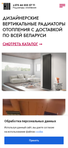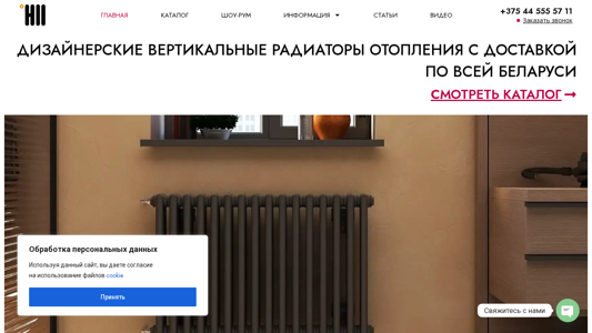 Сайт H2.by является розничным продавцом и установщиком дизайнерских вертикальных радиаторов для отопления в Минске, Беларусь. Компания предлагает доставку по всей Беларуси, а также предоставляет профессиональные услуги установки исключительно в Минске, включая внутреннее оформление и ремонтные работы для обеспечения комфорта клиента. Посетители сайта соглашаются на использование файлов cookie. Сайт предлагает каталог, информацию о способах оплаты и доставки, контактную информацию и номер телефона для запроса звонка обратно. Сайт доступен только на русском языке.