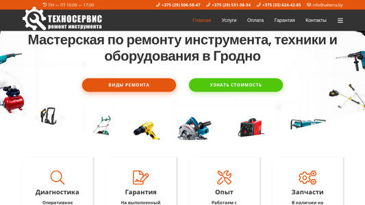 | SEO-описание | ⏩ ТехноСервис ⏪- Мастерская по ремонту строительного инструмента, электроинструмента, бензоинструмента, садовой и сельхозтехники, оборудования в Гродно, ЧМПУ «Салтерра». |