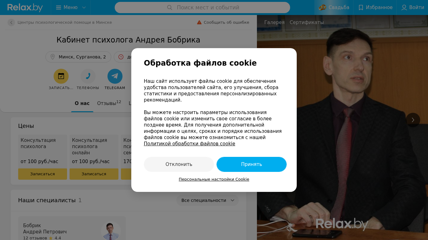 | SEO-описание | Кабинет психолога Андрея Бобрика в Минске – отзывы, телефоны, график работы и карта проезда на Relax.by |