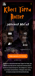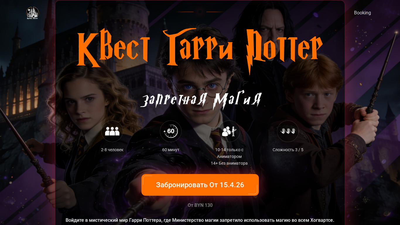 | AI-анализ | This online resource is a Harry Potter-themed quest named "Rooms of Magic - Запретная Магия," located in Minsk, Belarus. The website invites visitors to enter a magical world where the Ministry of Magic has forbidden the use of magic in all of Hogwarts. The quest is designed for fans who enjoy history, teamwork, and the thrill of discovery. Visitors will experience an authentic atmosphere, challenging multi-level puzzles, and the feeling of being in Hogwarts itself, right in Minsk. The adventure begins at the entrance, where visitors follow clues to open the gate and discover classes, artifacts, and powerful spells in a cinematic storyline. The puzzles are storyline-driven, with references to Diagon Alley, spell training, and Hogwarts castle. The environment features aged stone, potted plants |