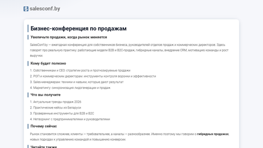 | SEO-описание | Увеличьте продажи, когда рынок меняетсяSalesConf.by — ежегодная конференция для собственников бизнеса, руководителей отделов продаж и коммерческих директоров. Здесь говорят про реальную практику: работающие модели B2B и B2C‑продаж, гибридные каналы, внедрение CRM, мотивацию команды и рост выручки.Кому будет полезноСобственникам и CEO: стратегии роста и прогнозируемые продажиРОП и коммерческим директорам: инструменты контроля воронки и эффективностиSales‑менеджерам: техники и навыки, которые дают результатМаркетингу: синхронизация лидогенерации и продажЧто вы получитеАктуальные тренды продаж 2026Практические кейсы из БеларусиПроверенные инструменты для B2B и B2CНетворкинг с предпринимателями и руководителямиПочему сейчас Рынок становится сложнее, клиенты — требовательнее, а каналы — разнообразнее. |