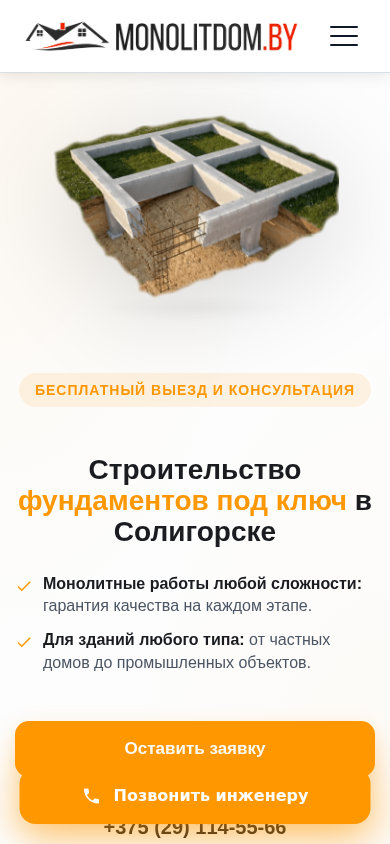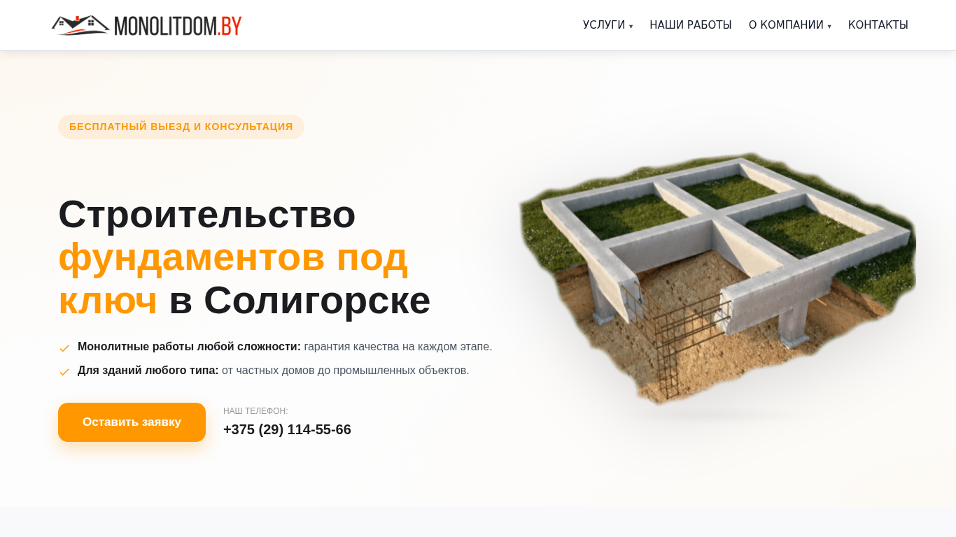 | SEO-описание | Профессиональное строительство фундаментов в Солигорске и области. Все виды монолитных работ: плита, лента, сваи. Опытные бригады, гарантия. |