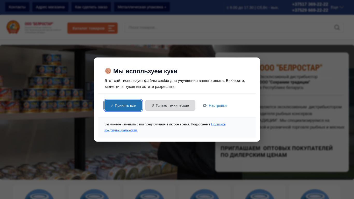 Этот онлайн-ресурс представляет собой белорусскую компанию "Белростар", специализирующуюся на оптовой, малом оптовом и розничной торговле высококачественными консервированными рыбными и мясными продуктами.