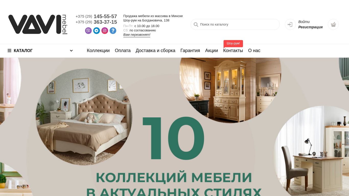 | AI-анализ | Сайт является онлайн-магазином мебели, расположенным в Минске, Беларусь, специализирующимся на современной мебели из дерева. Он предлагает услуги доставки и скидки до 50%. Главная страница включает номер телефона для справок и адрес местного магазина в Минске. Основное меню содержит каталог, коллекции, продажи, информацию о платежах и доставке, а также контакты. Каталог включает различные виды мебели, такие как кровати, столики, шкафы, зеркала, а также безопасные ограждения, буфеты и гардеробные. В магазине также есть возможность посещения в Мinsk для личного покупок. Сайт доступен на русском языке и предоставляет функцию поиска и регистрацию клиентов. Домен сайта — vavi.by. |