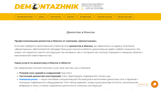 | SEO-описание | Демонтаж в Минске - снос и демонтаж недвижимости. Демонтаж пола, окон, дверей, стройматериалов, отделки, фундамента. Уборка и вывоз мусора |