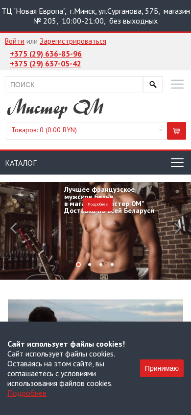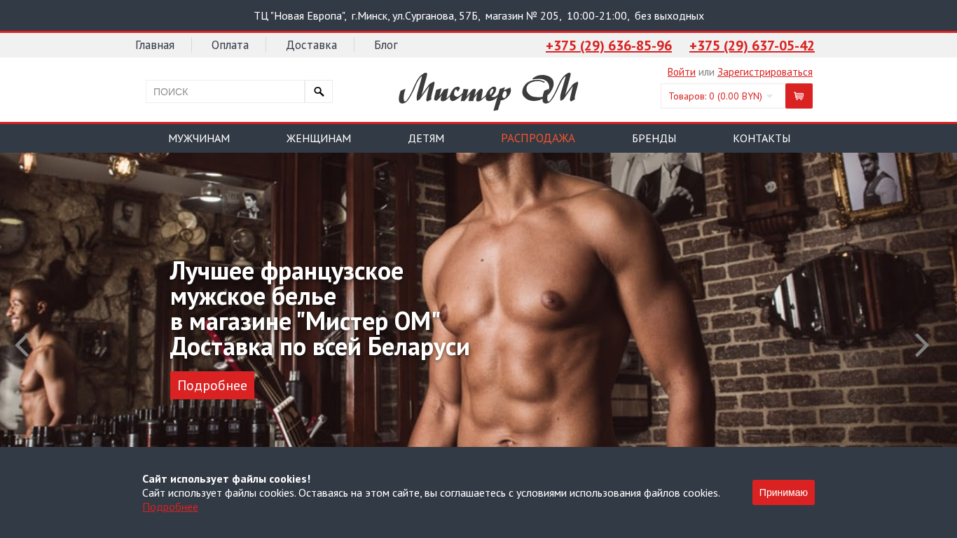 | SEO-описание | Мистер ОМ предлагает мужское белье и одежду для дома и отдыха европейских брендов HOM, IMPETUS, Ceceba, Gotzburg, Cornette. Заходите: ТЦ "Европа" г. Минск, ул.Сурганова, 57Б, магазин № 205. |