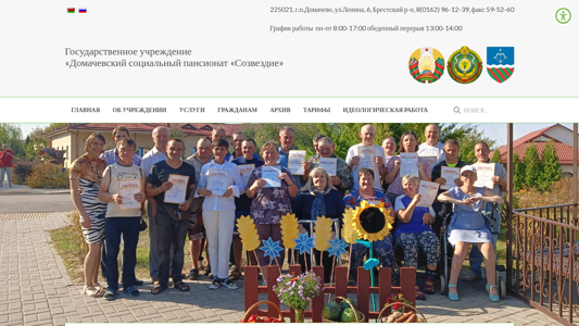 | SEO-описание | ГОСУДАРСТВЕННОЕ УЧРЕЖДЕНИЕ ДОМАЧЕВСКИЙ СОЦИАЛЬНЫЙ ПАНСИОНАТ СОЗВЕЗДИЕ |