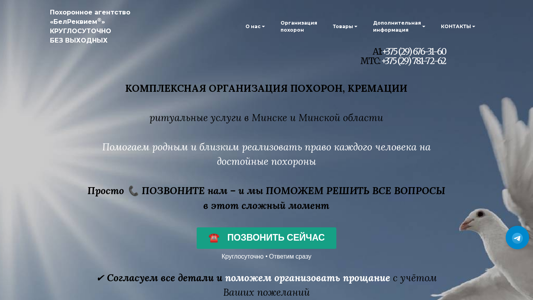 | SEO-описание | Ритуальные услуги в Минске круглосуточно. Похоронное агентство БелРеквием®. ПОМОГАЕМ РОДНЫМ И БЛИЗКИМ РЕАЛИЗОВАТЬ ПРАВО КАЖДОГО ЧЕЛОВЕКА НА ДОСТОЙНЫЕ ПОХОРОНЫ |