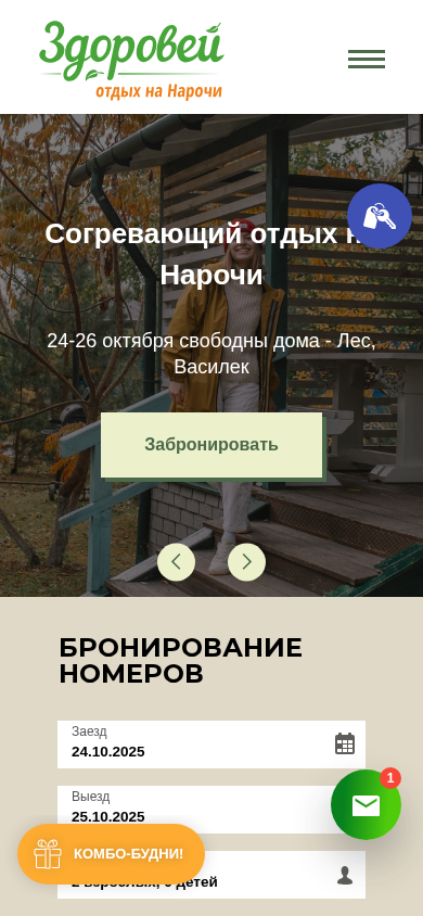 | Название / Заголовок | Отдых на Нарочи в домиках с комфортом, питанием и развлечениями. Отдых на Нарочи с питанием в загородном комплексе Здоровей. Вы сможете снять домик на берегу озера Нарочь, Мястро и Белое озеро |