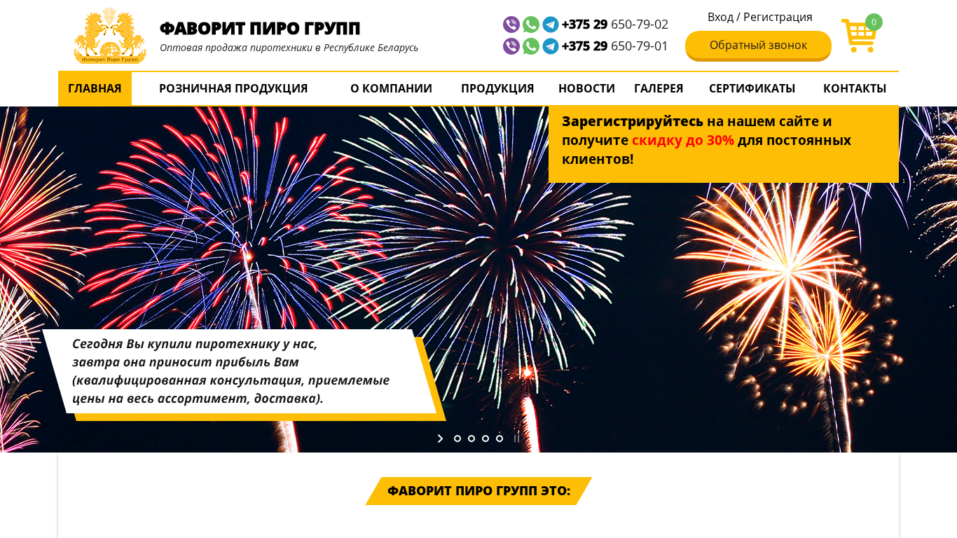 | SEO-описание | Фаворит Пиро Групп. Мы реализуем пиротехнику любых видов по низким ценам. Есть возможность доставки и рассрочки. Работаем по всей Беларуси. |