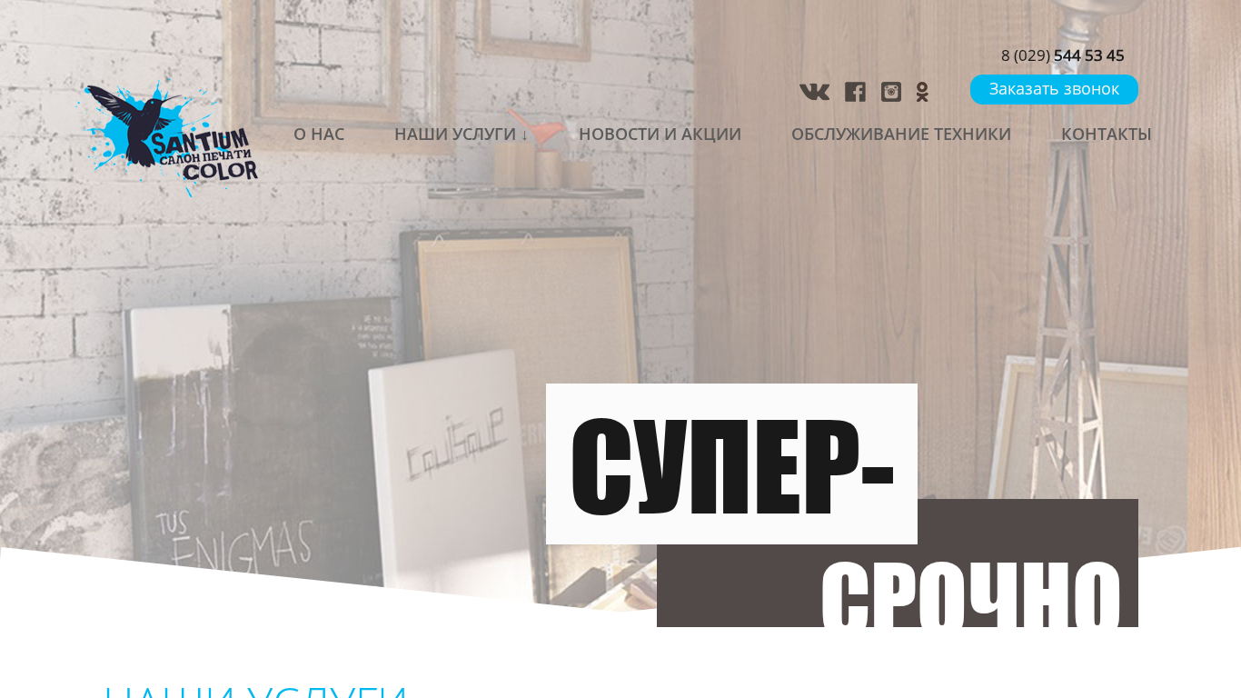| Ключевые слова | полиграфия печать в Бресте печать фото в Бресте печать на холсте визитки флаеры буклеты календари Брест графический дизайн картины на холсте широкоформатная печать фото Брест дизайн сантиум салон печати сантиум индивидуальный дизайн |