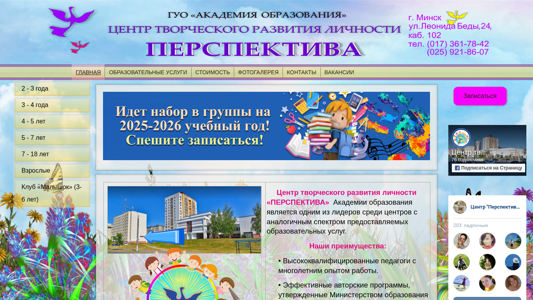 | SEO-описание | Центр творческого развития личности «ПЕРСПЕКТИВА» является одним из лидеров среди центров с аналогичным спектром предоставляемых образовательных услуг. Спектр предоставляемых Центром услуг достаточно широк, чтобы люди любого возраста, начиная с полутора лет, нашли у нас то, что может их заинтересовать. Все наши педагоги ежегодно проходят квалификационный конкурс на подтверждение соответствия по предоставлению той или иной образовательной услуги. Все наши авторские программы проходят экспертизу в Академии образования и утверждаются в Министерстве образования Республики Беларусь. |