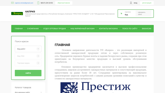 | SEO-описание | УП Каприз поставляет краски, эмали, лаки, олифы, клей, эмульсии, антисептики, шпатлевки, грунтовки, растворители, смывки, преобразователи ржавчины, разбавители, отвердители, различные составы во все регионы Беларуси. |