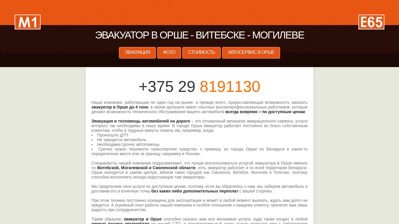 | SEO-описание | Эвакуация автомобилей в Витебской и Могилевской области: Орша, Витебск, Могилев, Толочин, по всей Беларуси и Россию. Эвакуатор в Орше круглосуточно. |