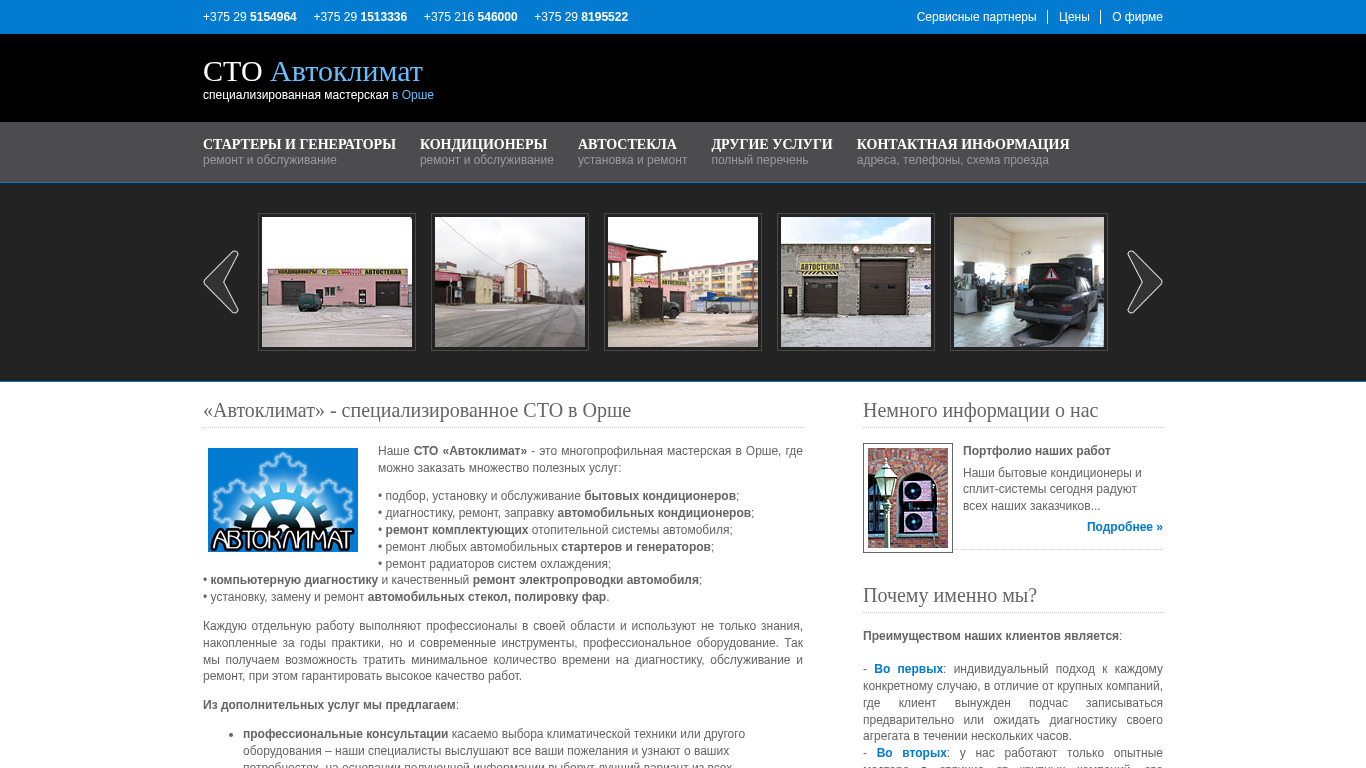 | SEO-описание | СТО «Автоклимат» в г. Орша предлагает профессиональный ремонт стартеров и генераторов на легковые и грузовые автомобили, монтаж и обслуживание автомобильных и бытовых кондиционеров в Орше, ремонт и установку автомобильных стекол и многое другое |