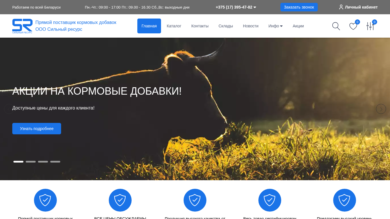 | SEO-описание | ООО «Сильный ресурс», предлагает широкий ассортимент кормов, премиксов и добавок для кормопроизводства по доступным ценам с доставкой по Беларуси. |