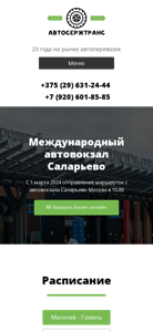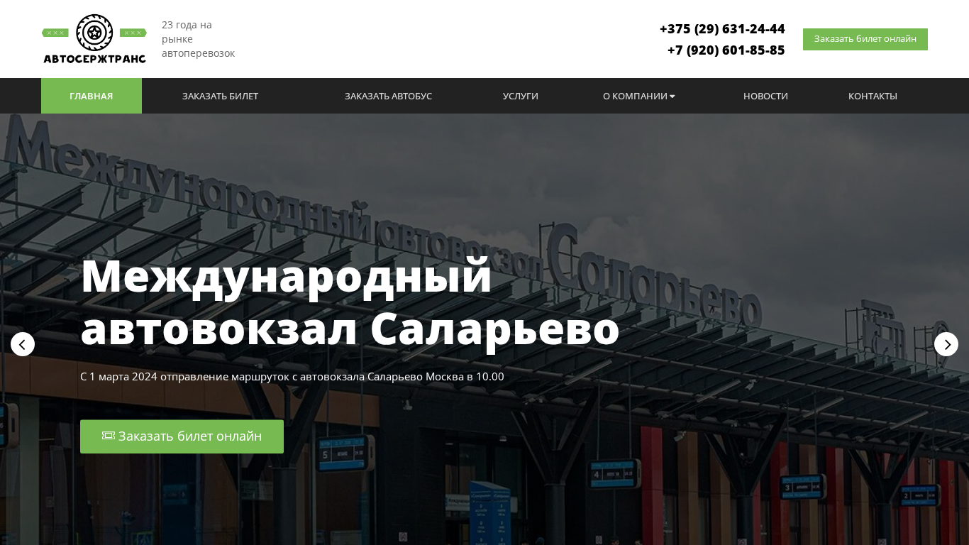 | SEO-описание | ЧПУП АвтоСержТранс - Лидер на рынке автоперевозок в Беларуси! У нас можно заказать автобус или Микроавтобус. Выполняем регулярные рейсы Могилев - Гомель - Могилев, Могилев - Белыничи, Могилев - Киев, Клинцы- Москва, Костюковичи- Москва, Клинцы - Костюковичи- Климовичи- Москва . |