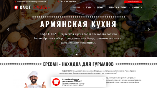 | SEO-описание | Кафе Армянской кухни ЕРЕВАН - это сочетание уютной атмосферы, отличной кухни и заботы о гостях. Вкусные блюда, караоке, шоу программа! Оперативная доставка блюд на дом и в офис. |