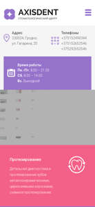 | SEO-описание | Современный стоматологический кабинет АксисДент в Гродно. Стоматологический кабинет АксисДент специализируется на предоставлении современной общей терапевтической, ортопедической и парадонтологической помощи для взрослых и детей. |