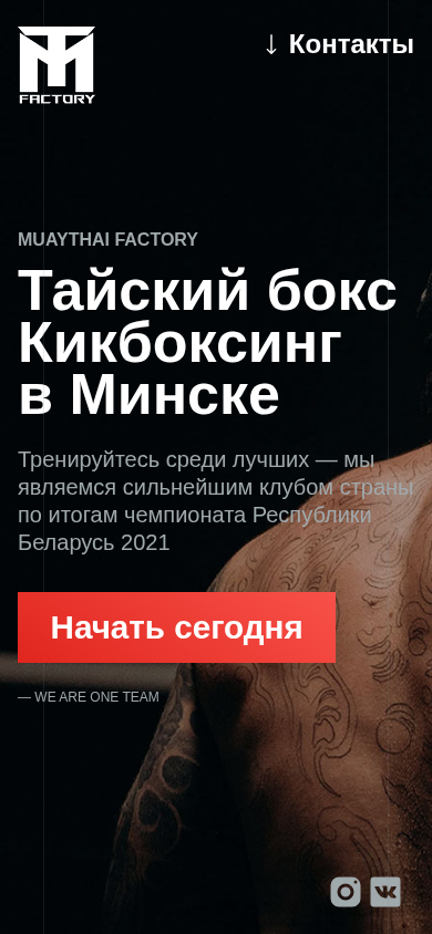 | SEO-описание | Клуб тайского бокса и К-1 под руководством Виталия Тишурова. MUAYTHAI FACTORY предлагает тренировки по тайскому боксу (муай тай) и кикбоксингу (К-1) в Минске. У нас вы овладеете необходимыми навыками самообороны и получите другие преимущества занятий боевыми искусствами. |