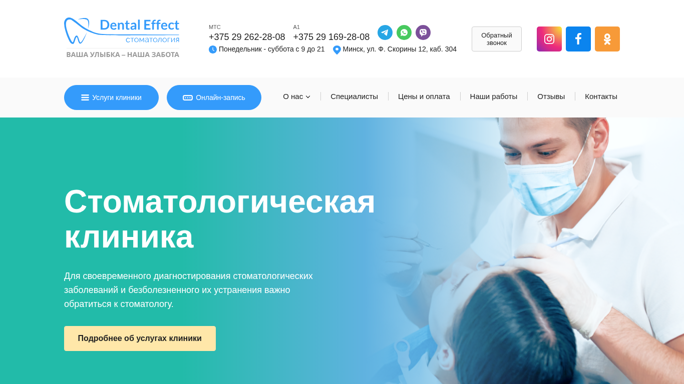 | SEO-описание | Стоматология в Минске «Dental Effect». Стоматологические услуги: имплантация, протезирование и лечение зубов любой сложности по выгодным ценам. ✔ Опытные специалисты. ✔ Новейшие технологии. Записаться на консультацию ☎+375 (29) 169-28-08. |