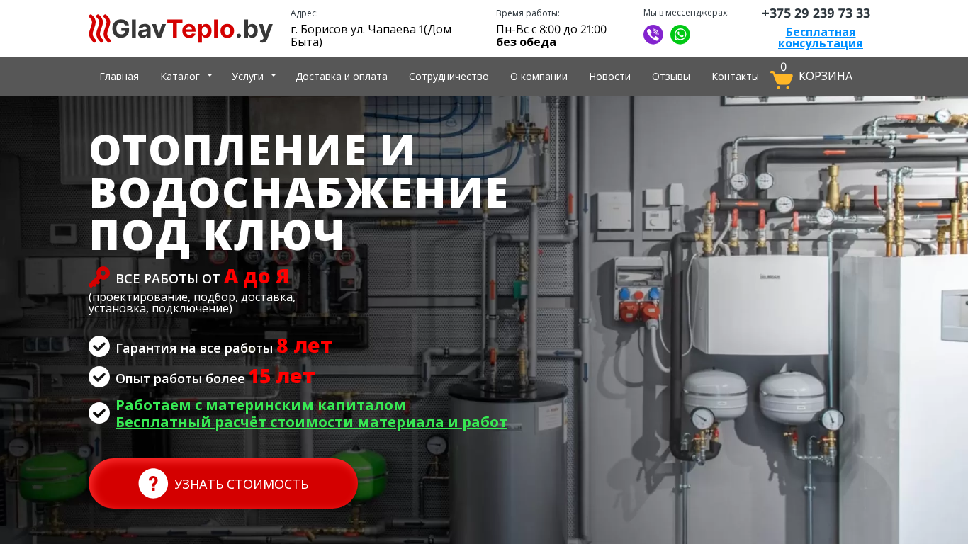 | SEO-описание | Наши профессиональные услуги по монтажу отопления и водоснабжения под ключ в Борисове, Жодино, Смолевичах и Крупках обеспечивают вашему дому комфорт и эффективность. Мы тпредлагаем широкий выбор отопительных приборов, включая котлы, радиаторы. +375 29 239 73 33 Г. Борисов ул. Чапаева 1(Дом Быта) |