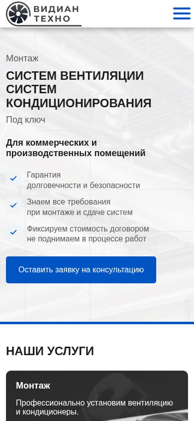 | SEO-описание | ООО «Видиан-техно» предлагает профессиональные услуги по монтажу вентиляции и систем кондиционирования в Минске и по всей Беларуси. Современные решения для жилых и коммерческих помещений. Качество, надежность и гарантия. |