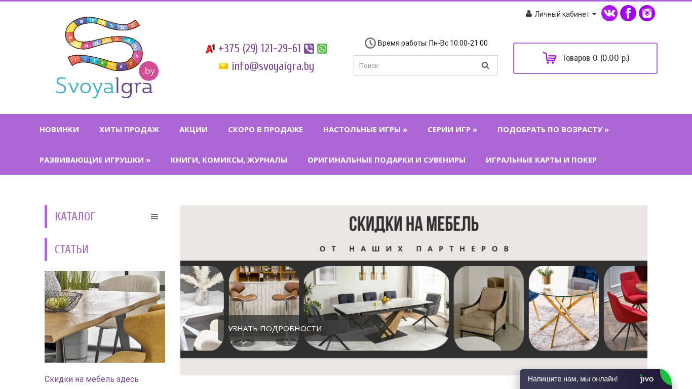 | SEO-описание | Интернет магазин настольных игр Svoyaigra.by: фото, отзывы. Купить настольную игру по самой выгодной цене ✅. Акции и скидки. |