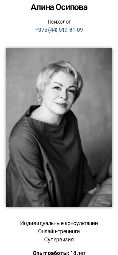 | SEO-лексика | выдан год получения белорусская медицинская академия последипломного образования алина осипова консультации психолог индивидуальные супервизия онлайн-тренинги 375 519-81-09 институт опыт работы |