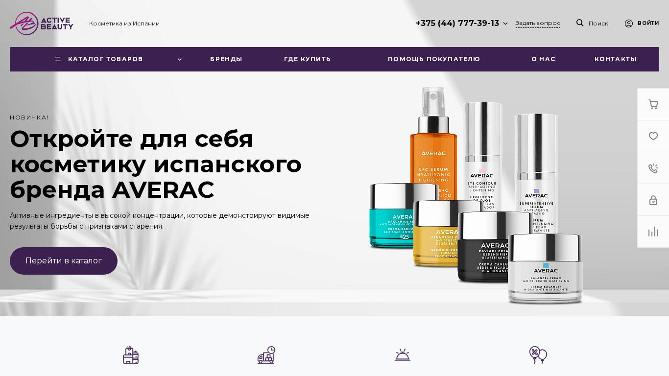 | SEO-описание | Испанская уходовая косметика в интернет магазине ACTIVE-BEAUTY.BY - Первый поставщик в РБ ✨ Быстрая доставка ✨ Доступные цены ✨ Качественная продукция от испанских брендов |