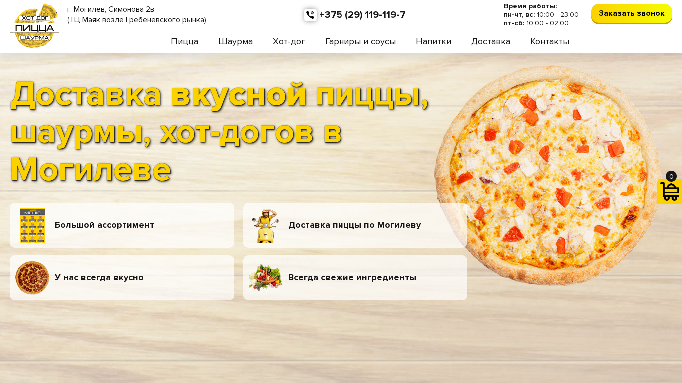 | SEO-описание | Доставка вкусной 🍕 пиццы, 🌭 хот-догов и 🌯 шаурмы в Могилеве. При заказе от 25р – бесплатная доставка! ☎ +375 (29) 119-119-7. |