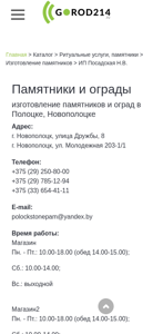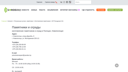 | Ключевые слова | ритуальные услуги ИП Посадская Н.В. изготовление памятников ограды скамейки вазы уборка захоронения мойка памятников и площадок покраска оградок гранит Посадская памятники гранитные памятники ритуальные ритуальное агентство ритуальные принадлежности гроб изготовление оград ип посадская |