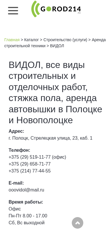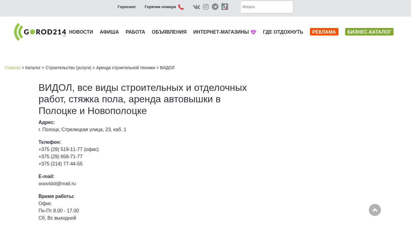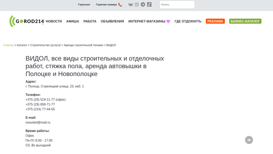 | SEO-описание | ВИДОЛ, все виды строительных и отделочных работ, стяжка пола, аренда автовышки в Полоцке и Новополоцке |
