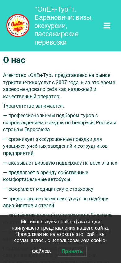 | Название / Заголовок | "ОлЕн-Тур" г. Барановичи: визы, экскурсии, пассажирские перевозки — Аренда автобусов, визовая поддержка, туры выходного дня, экскурсии, визы, сайт олен-тур |