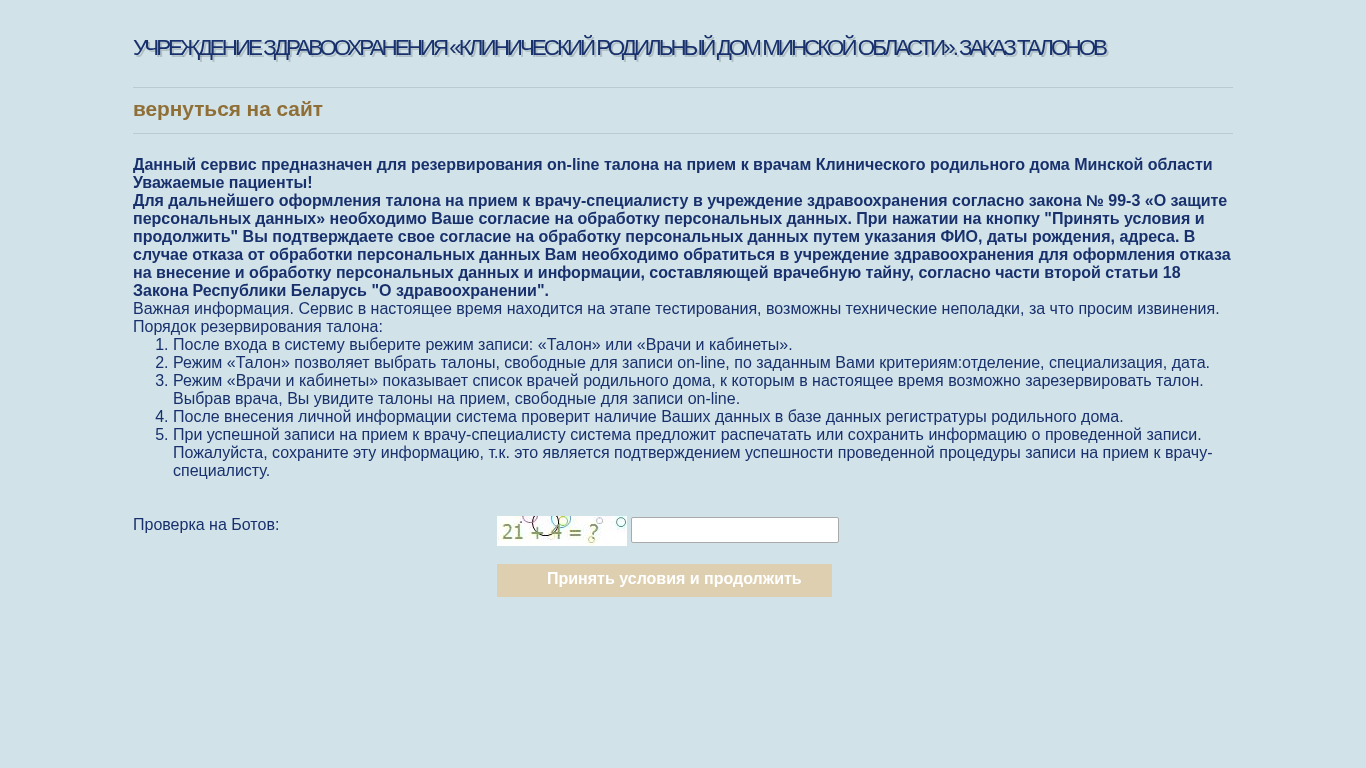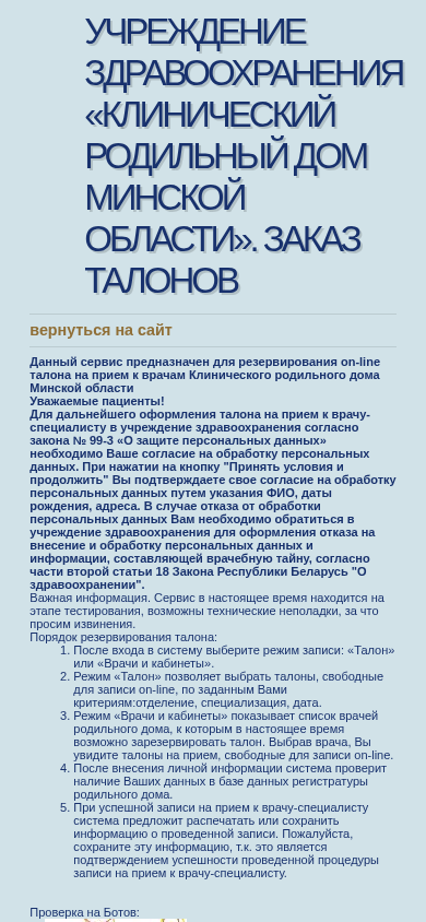 | Название / Заголовок | Учреждение здравоохранения «Клинический родильный дом Минской области». Заказ талонов |