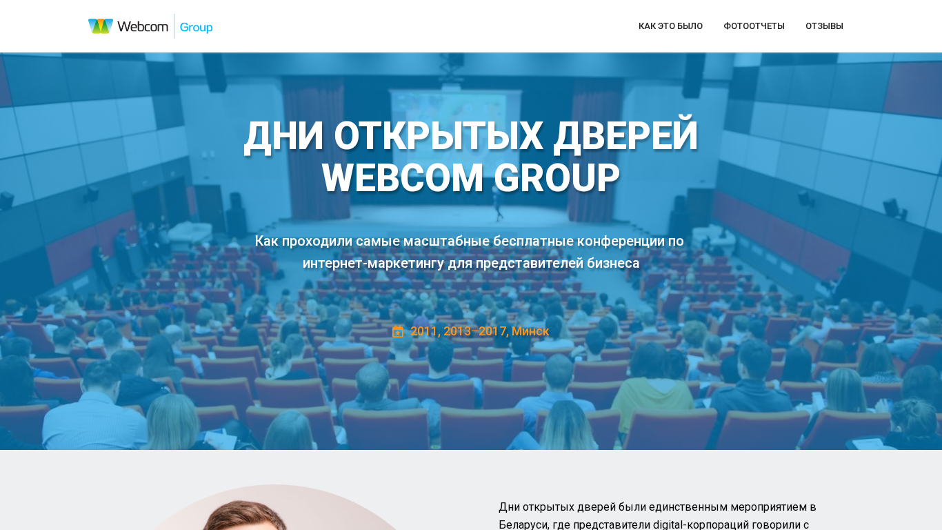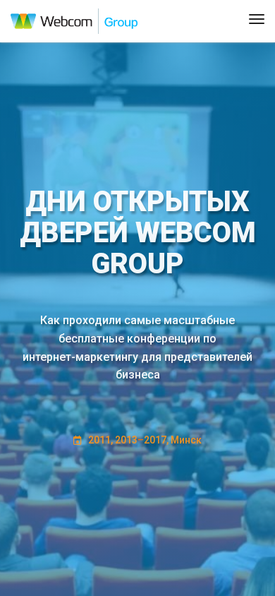 | SEO-описание | Webcom Group — одна из самых влиятельных компаний в сфере интернет-маркетинга Беларуси. Поэтому День открытых дверей — особенное мероприятие и возможность поделиться нашими ценными знаниями и опытом. |