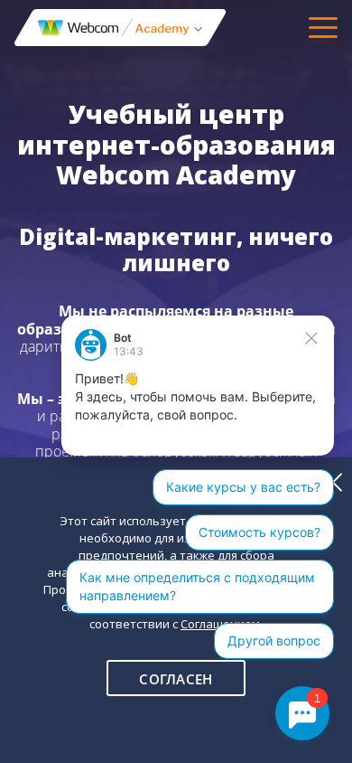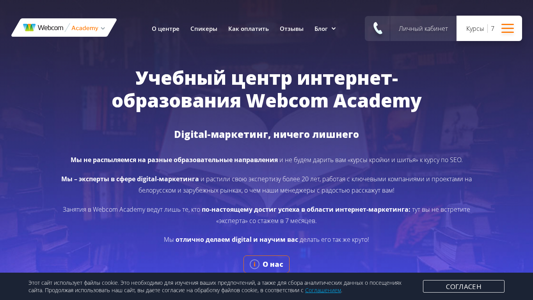 | SEO-описание | Профессиональные курсы в Минске от Webcom Academy ✔️ Обучающие курсы в направлениях: SEO, интернет-маркетинг, контекстная реклама, веб-аналитика, SMM, нейросети ⭐ Онлайн-обучение на образовательных курсах в Минске |