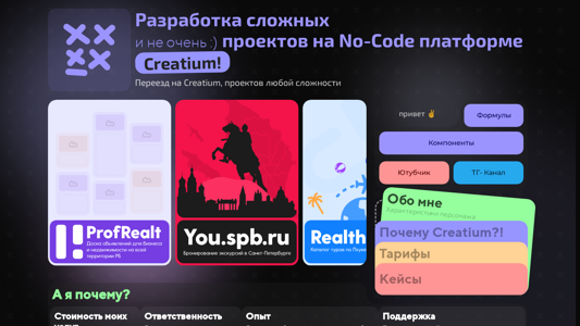 Занимаюсь full-stack разработкой, ребрендингом и переносом веб-сайтов на Creatium. Быстро, недорого и без хлопот — вам останется только наслаждаться результатом! |