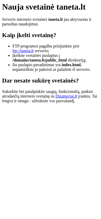 AI-анализ | This is the new website taneta.lt, an active and updated internet site hosted on the server internetos svetainei taneta.lt. To upload your website, use an FTP program and connect to ftp://taneta.lt server; upload your web pages into /domains/taneta.lt/public_html directory. Note that the file name of your home page is index.html; make sure to change or delete it accordingly. If you haven't created your website yet, create and customize a functional, attractive, and easily found internet site with Dizaineriai.lt tools. It's easy and affordable - take control of your website. |