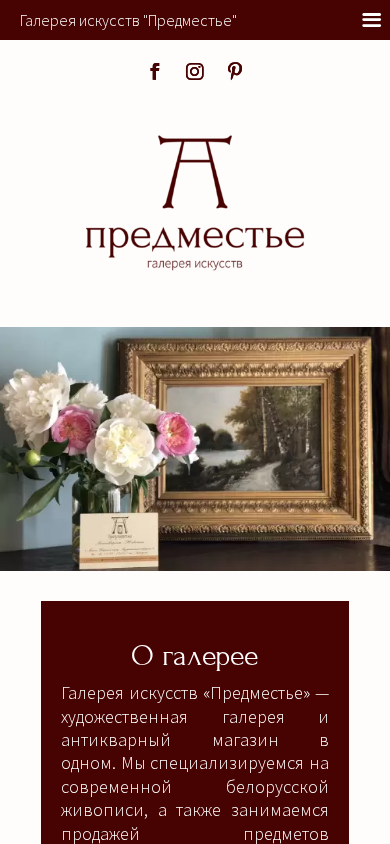 | SEO-описание | Галерея искусств "Предместье" в Минске в Минске. ✓ Большой выбор живописи 19-20 вв. ✓ Уникальные антикварные предметы. ✓ Услуги реставрации предметов, аренды помещения и предметов живописи, антиквариата. ☎ +375 (29) 604-62-31 |